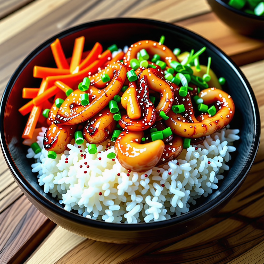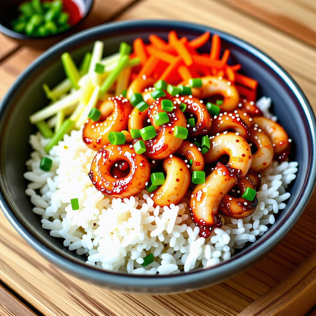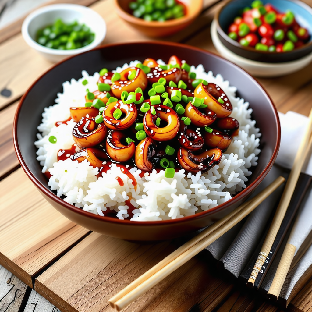 볶은 오징어와 채소를 밥 위에 올려줍니다. 이때, 밥은 따뜻하게 준비해 주는 것이 좋습니다. 오징어 덮밥은 비주얼도 중요하니, 예쁘게 담아주면 더욱 맛있어 보입니다.
